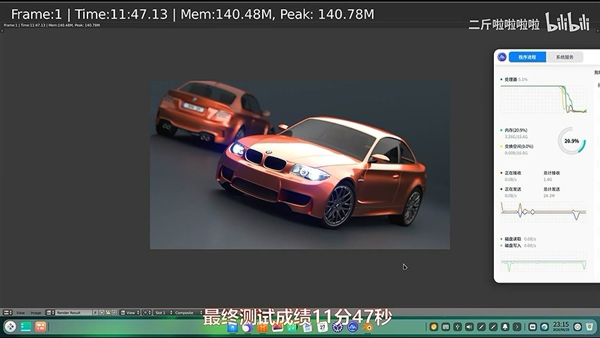 测试方面,UP主以视频编辑为主,只跑了一个Blender BMW,结果耗时11分47秒,并不理想。