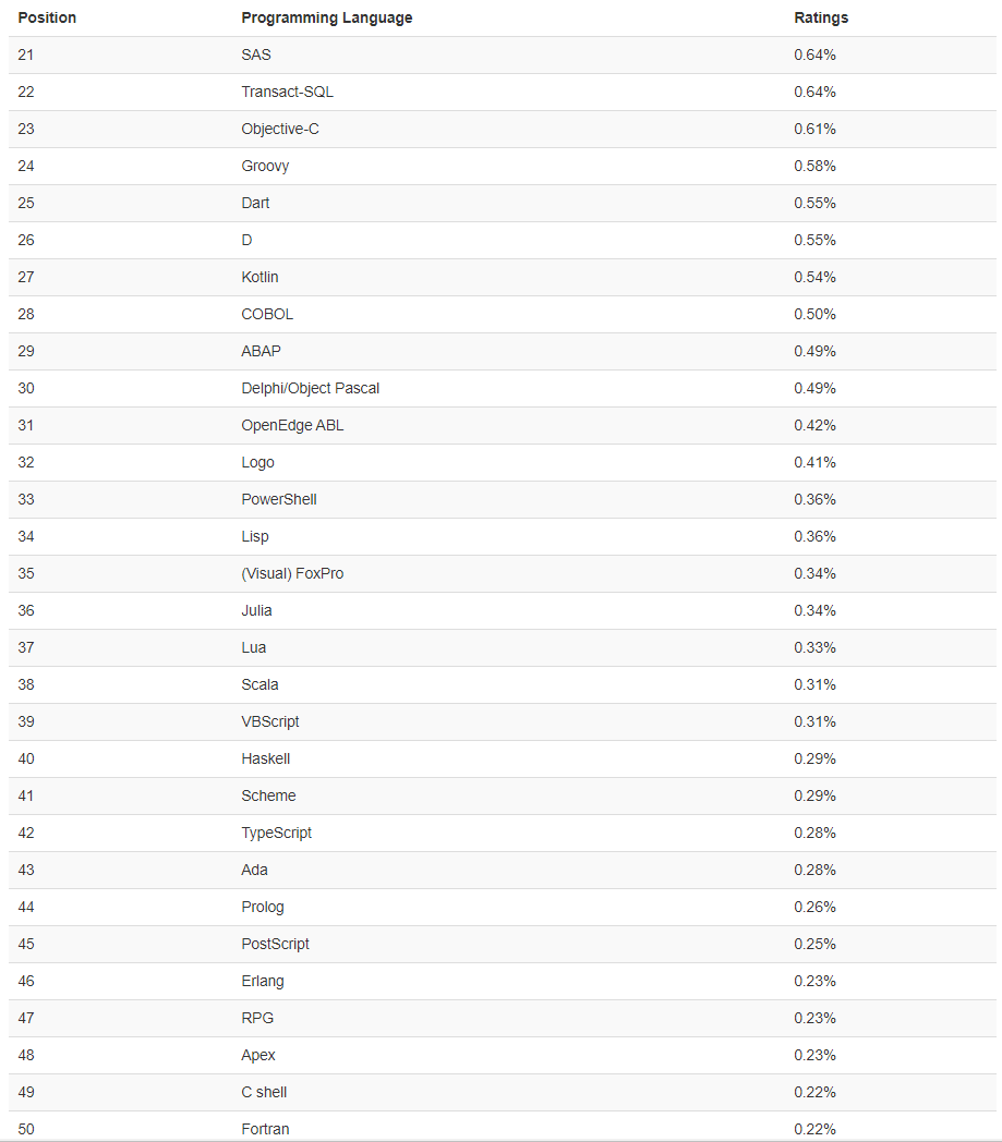 目前处在 top 20 危险边缘的是排名下降的 PL/SQL 和 Classic Visual Basic 语言。上月掉出前 20 的 Objective-C 还在下掉,本月排名 23。Delphi/Object Pascal 直接从 22 名变成第 30 名。