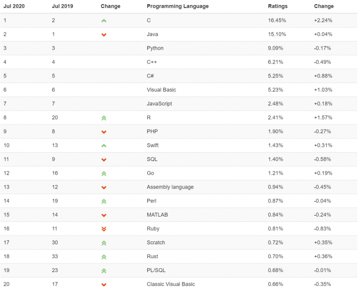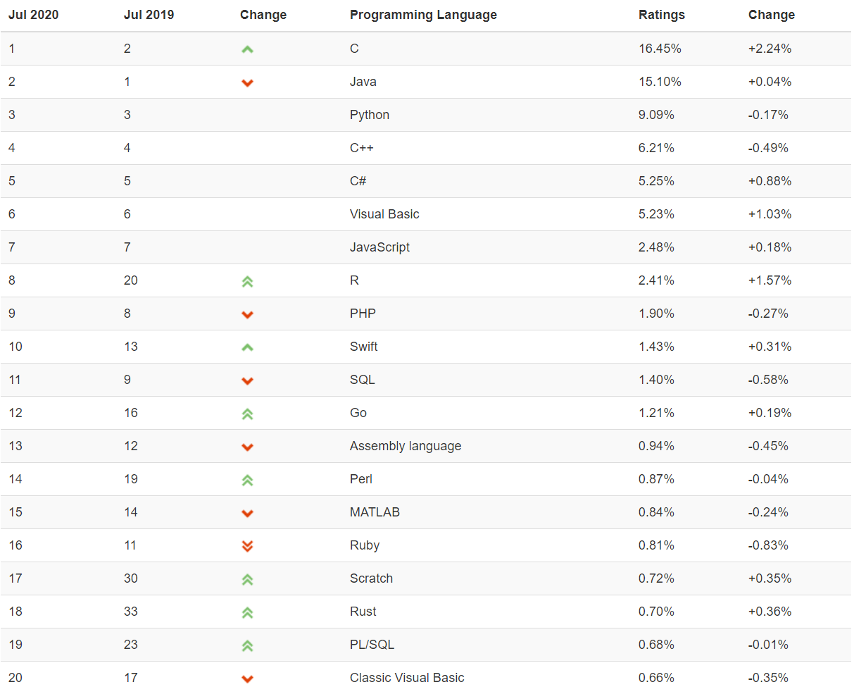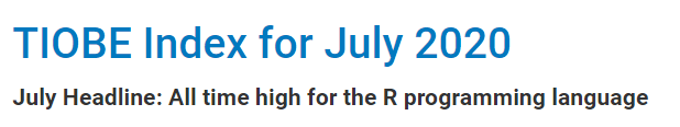 TIOBE 已公布 2020 年 7 月的编程语言排行榜。在本期榜单中,各类应用于数据科学的语言是一大亮点。尤其是 R 语言,本月上升至第 8 位,创造了新的记录,TIOBE 称这是 R 语言“史无前例的高光时刻”。Python 不用说,一直在统计语言中拔得头筹,而 R 在 Python 如此强劲的势头下,还能保持流行度的上升。