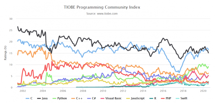 TOP 10 编程语言 TIOBE 指数走势(2002-2020)