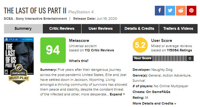 《最后的生还者2》可能是本世代最具争议性的游戏之一,尽管本作获得了海内外媒体的大量好评,但玩家评价分裂比较严重,这一点在Metacritic用户评分上体现最为明显。《最后的生还者2》起初在MTC上的用户评分只有3.4分,玩家的怒火可见一斑。不过近来,外媒发现本作在MTC上的用户评分上涨到了5.2。
