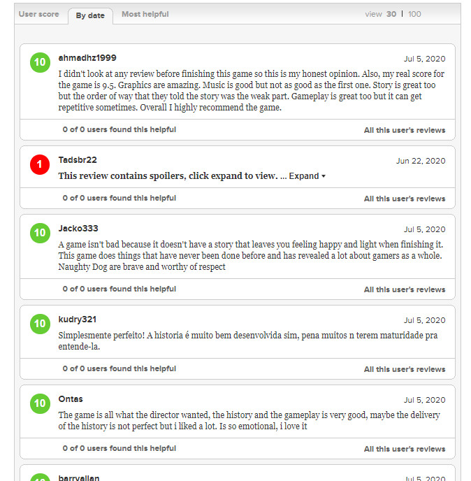 如果仔细查看《最后的生还者2》MTC用户评分,按照日期查看,你会发现最近涌现了一大批的正面评价,大部分都打出了10分好评,而且时间都集中在7月5日。