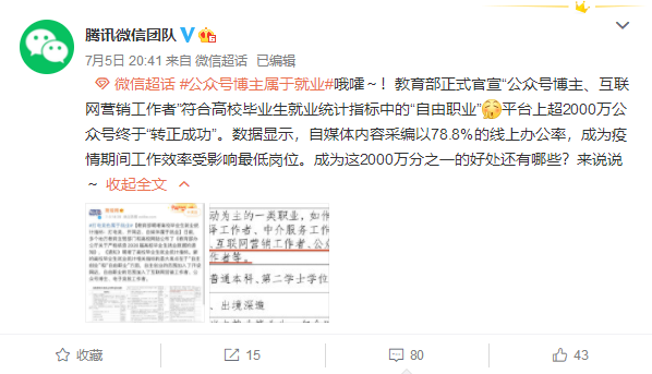 7月5日,教育部正式官宣“公众号博主、互联网营销工作者”符合高校毕业生就业统计指标中的“自由职业”。对此,微信方面表示,平台上超2000万公众号终于“转正成功”。数据显示,自媒体内容采编以78.8%的线上办公率,成为疫情期间工作效率受影响最低岗位。