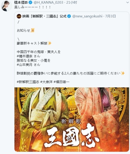 出演黄月英的桥本环奈昨日还在推上转发了卡司推文,对《新解释三国志》表达了期待。