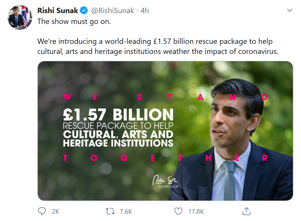 除此之外,英国政府周日还宣布了一项15.7亿英镑的救助计划以此来帮助苦苦挣扎的艺术行业。这条消息则由英国总理里什·苏纳克在Twitter上发布: