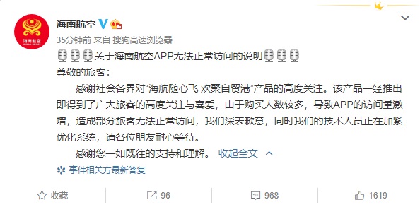 对此海南航空方面表示,由于购买人数较多,导致APP的访问量激增,造成部分旅客无法正常访问,我们深表歉意,同时我们的技术人员正在加紧优化系统,请各位朋友耐心等待。