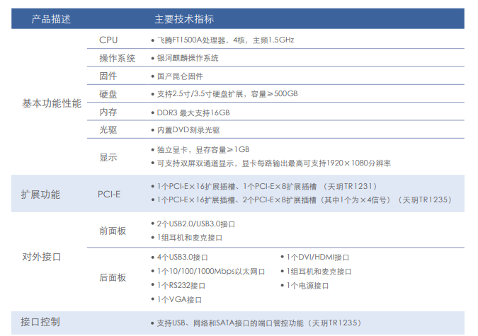 简单来说,天玥系列计算机共有4种型号和9种产品,分为通用和专用两大类,具体的四种型号包括TR1231、TR1235、TR117*和TR3231。