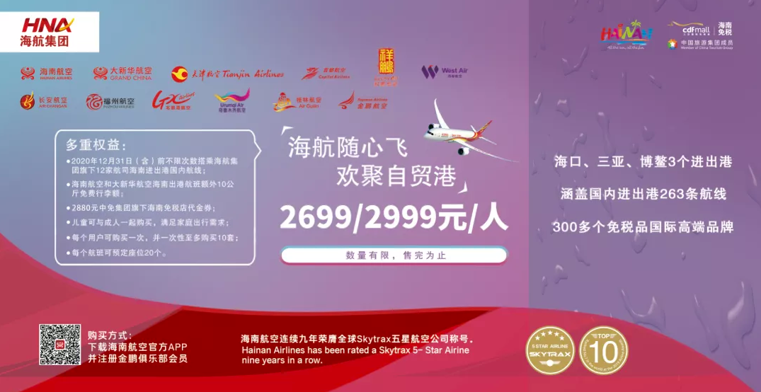 据悉,“海航随心飞、欢聚自贸港”产品将以2000多元的超值定价,为旅客提供有效期内不限次海南进出港国内航班乘机权益,同时叠加赠送2880元中免集团海南免税店代金券购物权益以及海南航空、大新华航空海南出港航班额外10公斤免费行李额权益,并适用于海航集团12家航司,可通达100多个国内城市。