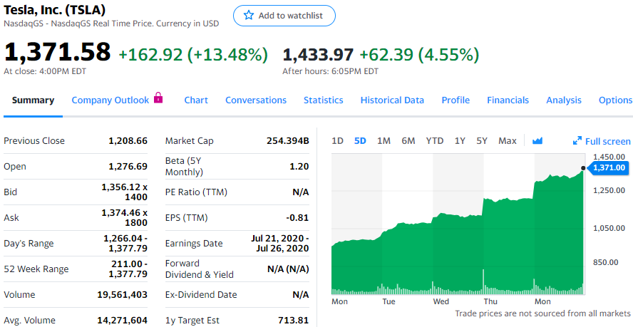 多名分析师因第二季度交付量超过预期而上调目标股价后,特斯拉股价星期一涨幅超过13%,5个交易日中涨幅接近43%。特斯拉上周四公布高于预期的第二季度汽车交付量后JMP证券公司将其目标股价由1050美元上调至1500美元。JMP证券分析师约瑟夫·奥沙(Joseph Osha)发表投资报告称,“我们认为,目前要考虑的问题不是特斯拉当前估值是否过高,而是其增长和竞争态势,对其股价未来数年的影响”,并预测2025年特斯拉营收将达到1000亿美元。摩根大通对特斯拉评级为“减持”,将其目标股价由275美元上调至295美元。德意志银行将特斯拉目标股价由900美元上调至1000美元。据Refinitiv的资料显示,分析师给出的特斯拉目标股价中位值是675美元,远低于1371美元的当前股价。第二季度漂亮的交付数据,提高了外界对特斯拉第二季度盈利的预期:特斯拉可能获得新的突破:有史以来首次连续4个季度盈利。过去一年,特斯拉股价上涨近500%。今天常规交易中,特斯拉股价上涨162.92美元,涨幅为13.48%,报收于1371.58美元。盘后交易中,特斯拉股价一度上涨62.39美元。