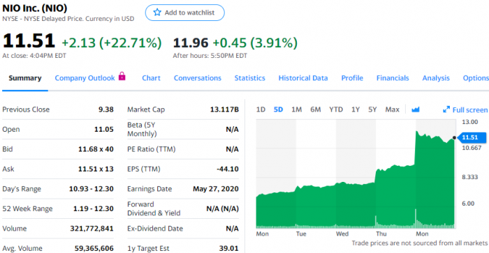 蔚来股价五连涨,累计涨幅达到约67%