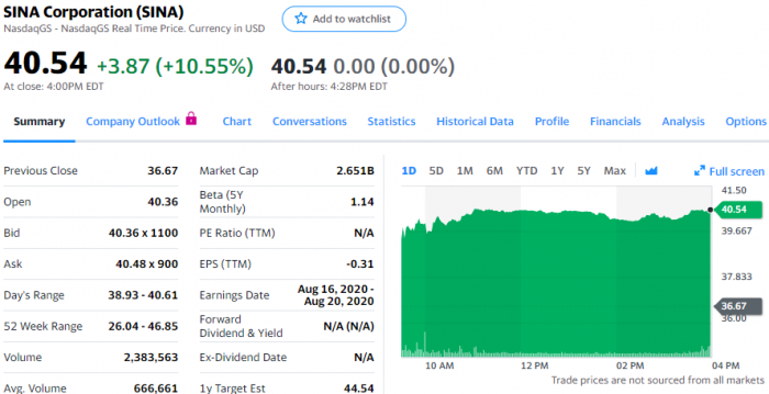 退市消息推动新浪股价涨幅超10%