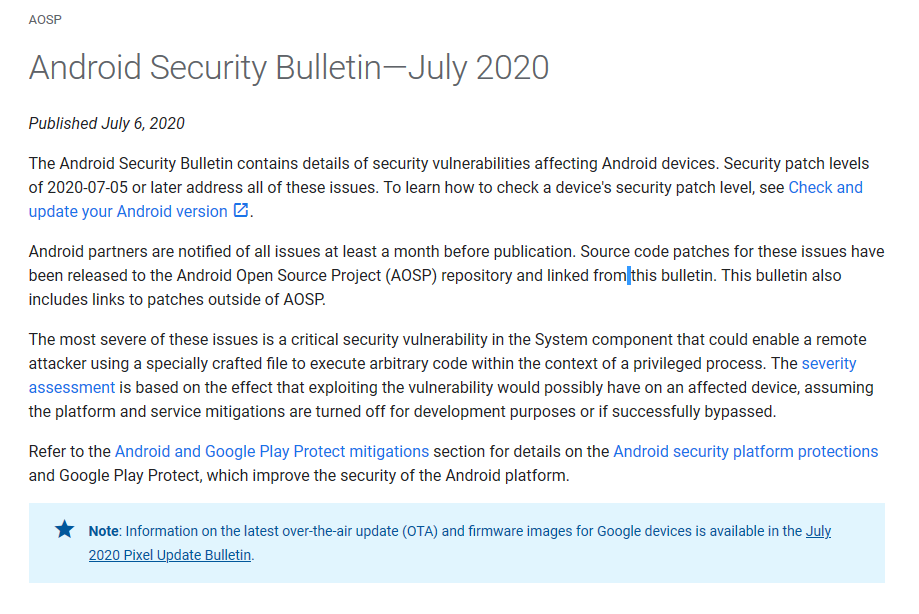 今天早些时候,谷歌发布了2020年7月的 Android 安全公告,和往常一样包含 2020-07-01 和 2020-07-05 两个安全补丁程序级别。其中前者主要包括 Android 和谷歌服务的相关漏洞修复,而后者还包括针对博通、联发科和高通组件的修复。