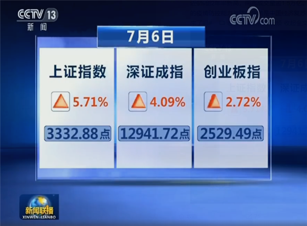 近日,A股大涨。牛市真的来了吗?7月6日,《新闻联播》用时1分12秒报道A股,介绍沪指涨近6%创2年半新高,两市成交量逾1.5万亿。截至6日收盘,上证指数上涨5.71%,报收3332.88点;深证成指涨4.09%,报收12941.72点;创业板指涨2.72%,报收2529.49点。