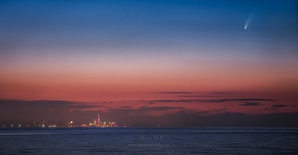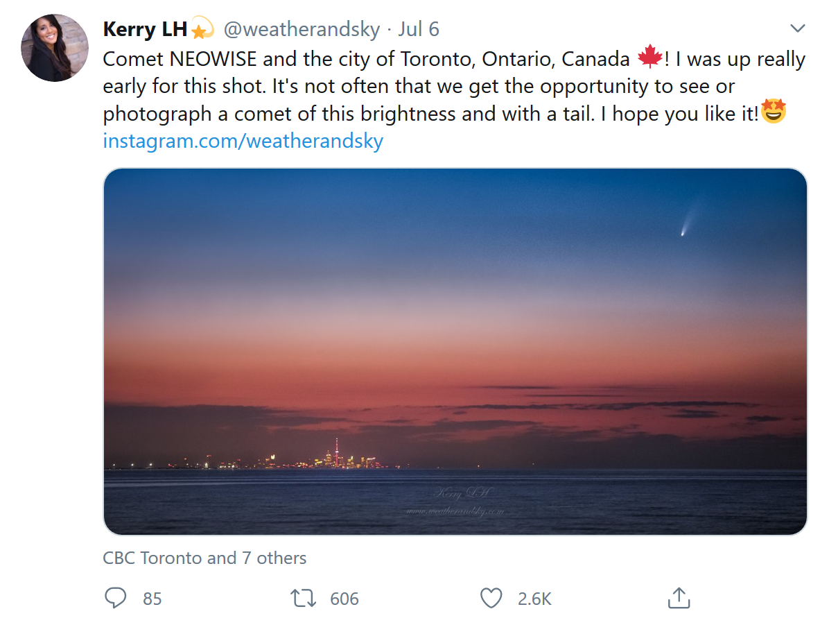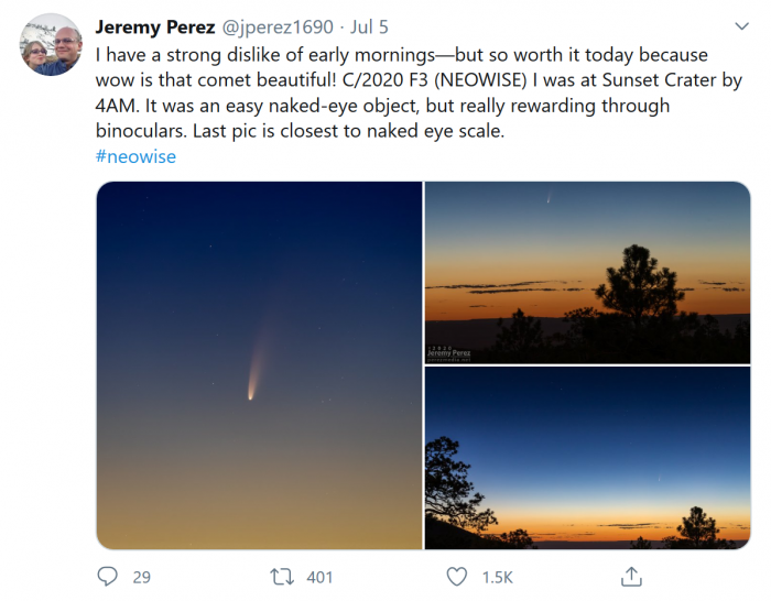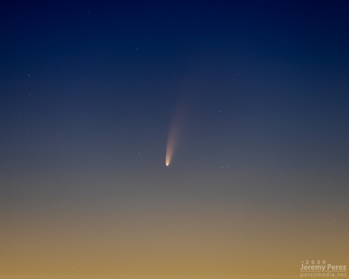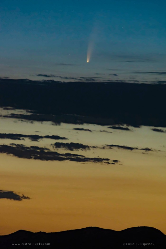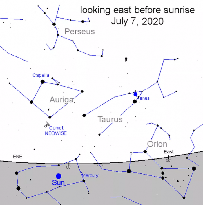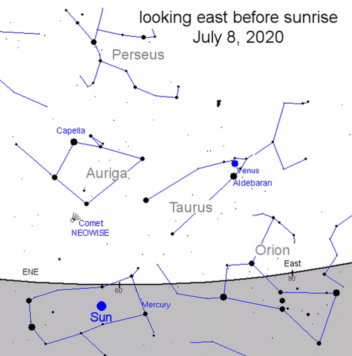 随着彗星Neowise离太阳越来越远、离地球越来越近,它的可见状态将从黎明前持续到夜晚。