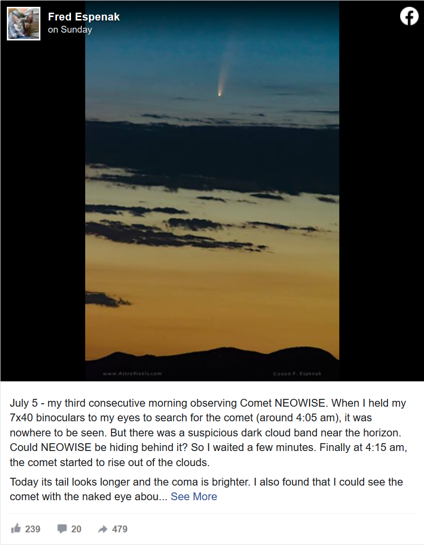NASA太阳系大使Eddie Irizarry表示,在7月11日之前,该彗星将在第一缕光线出现之前和之后一直都是可见的。等到7月15-16日的晚上它将再次出现。而在7月下半月,当它在天空中稍高的时候人们应该更容易看到它。在那之前,它会更接近东北地平线。